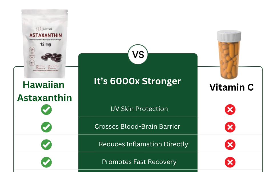 Clarity MD's Hawaiian Astaxanthin is naturally grown under Hawaiian sunlight at the exact 12mg clinical dose, non-GMO, and third-party tested—the same grade used in research showing real skin, brain, and cardiovascular benefits.